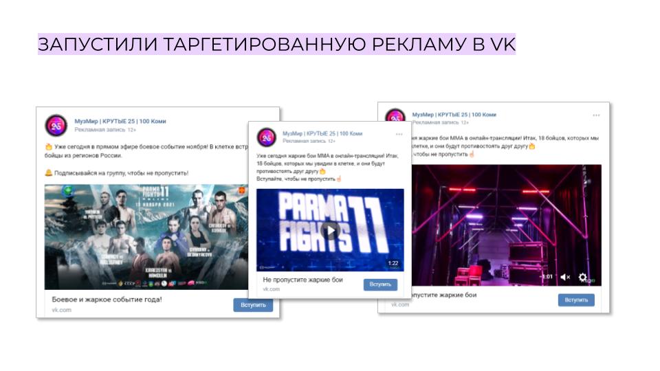 Освещение трансляции турнира смешанных боевых единоборств Parma Fights 11: Online в соцсети ВК. Повысить интерес к теме, привлечь пользователей к просмотру проводимой онлайн-трансляции в качестве зрителей.