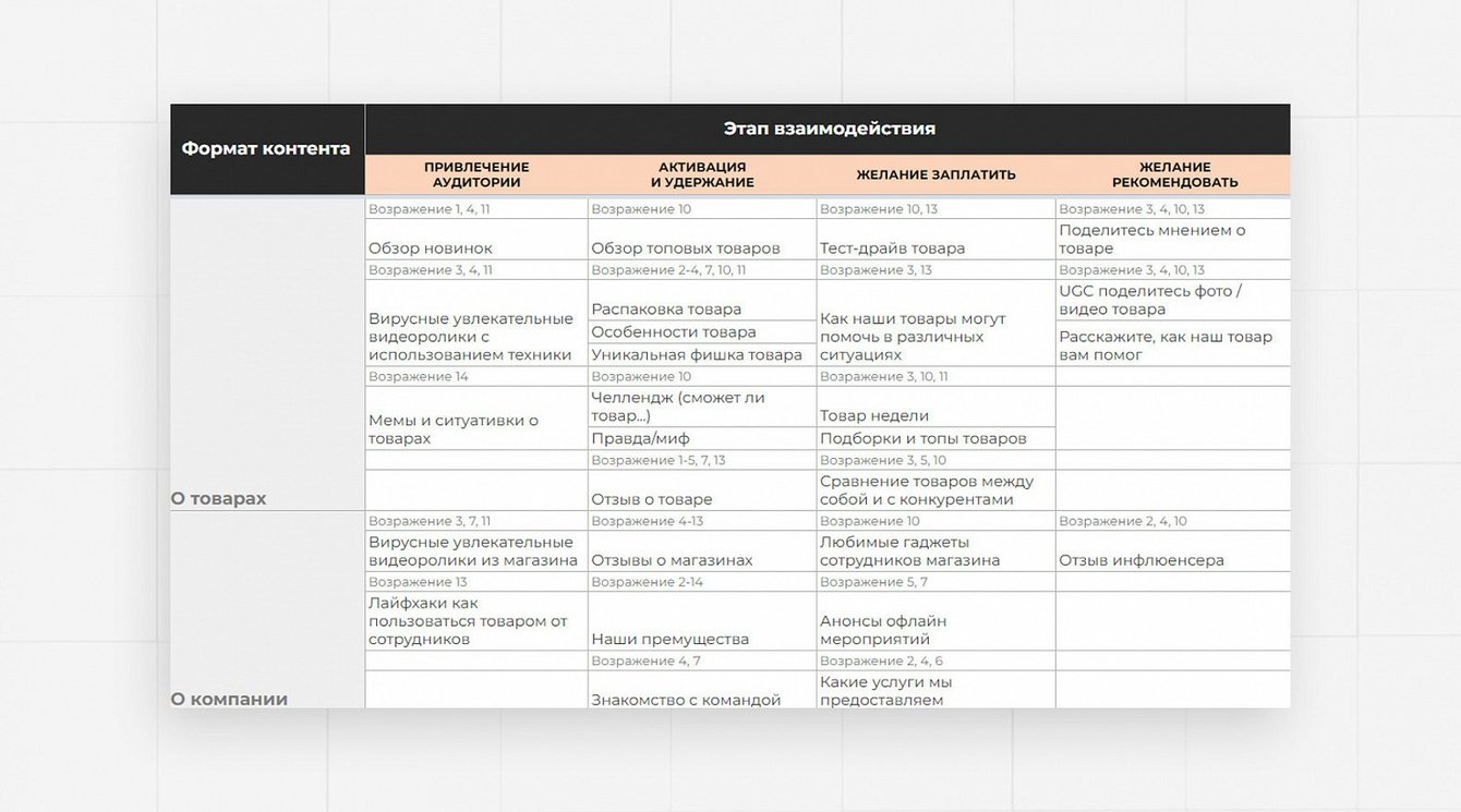 Матрица контента — источник идей для постов и писем в рассылку. В отличие от контент-плана, в ней нет конкретных тем. Матрица основана на форматах публикаций, воронке и основных возражениях клиентов.
