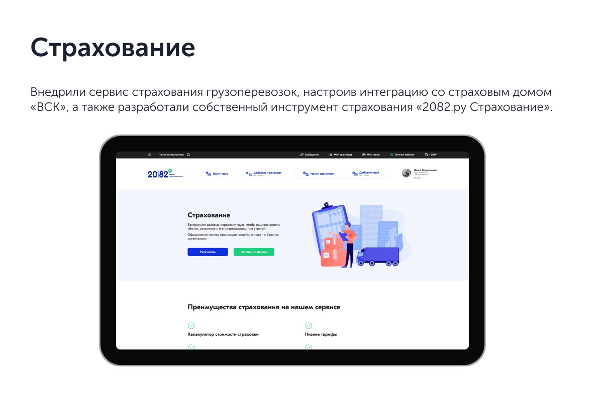 - Внедрили сервис страхования грузоперевозок, настроив интеграцию со страховым домом «ВСК».