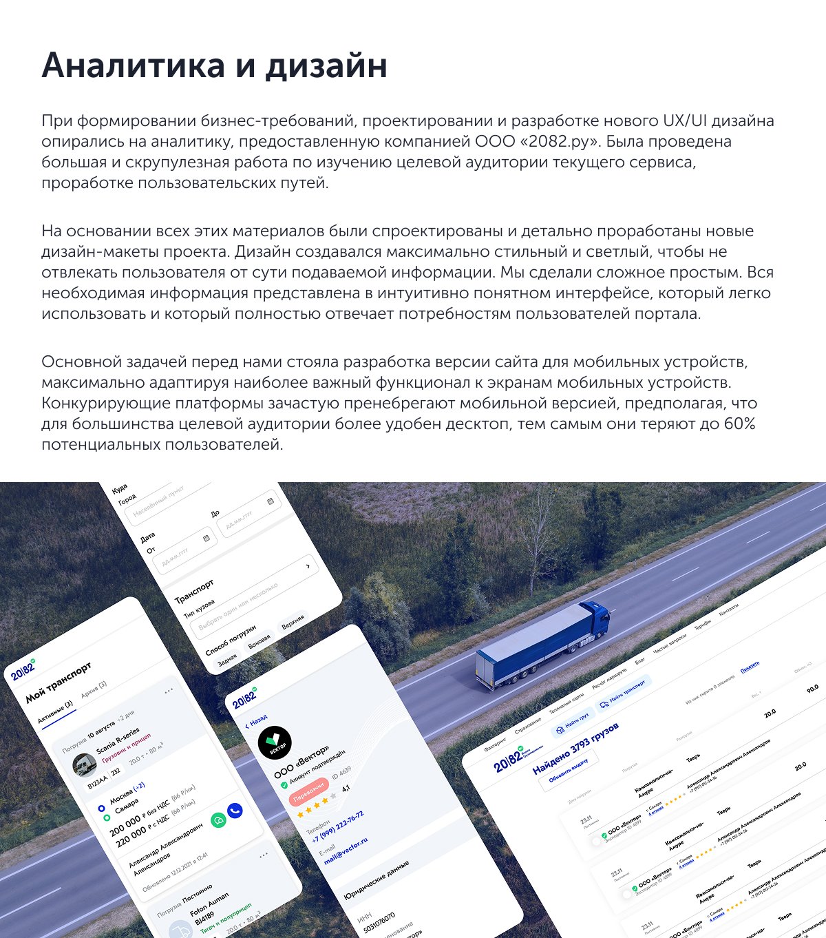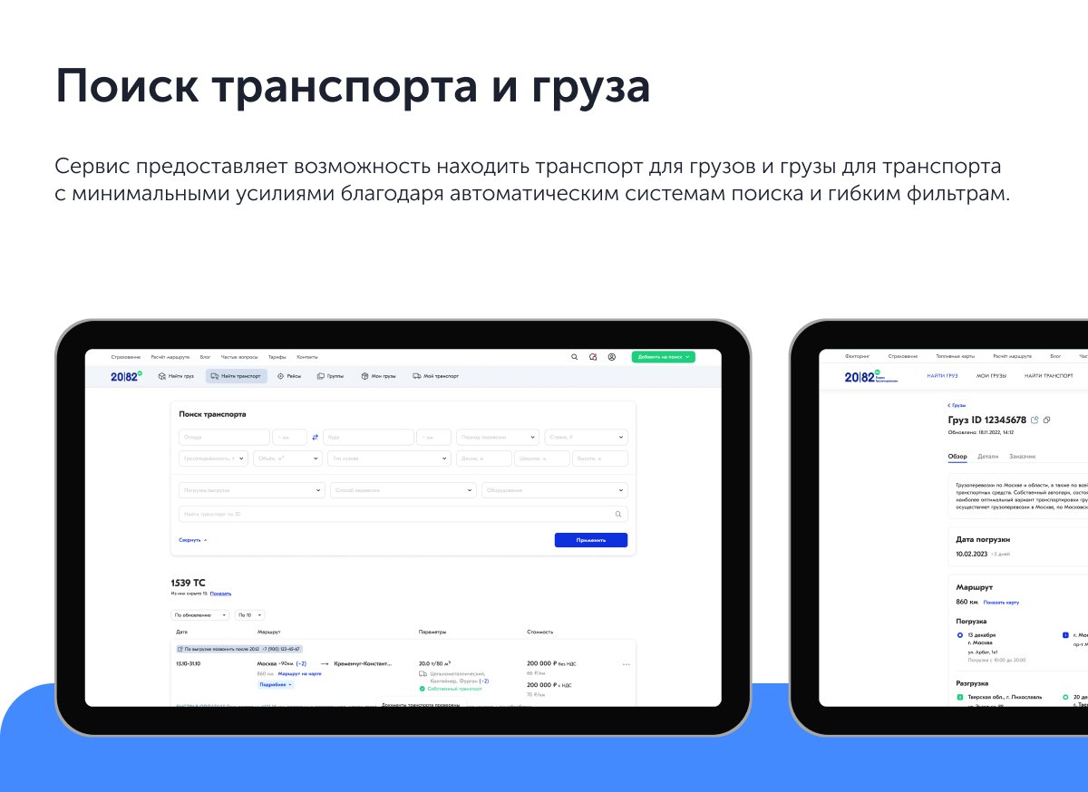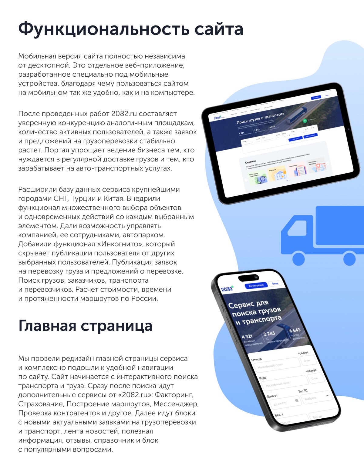 2082.ru — это портал грузоперевозок, где заказчики размещают заказы на перевозки, а перевозчики объявления о свободном транспорте.