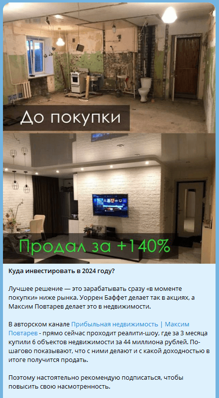 Инвестор Максим Повтарев занимается покупкой с торгов и редевелопментом недвижимости в Москве и МО, а затем — ее перепродажей по максимально выгодной цене. В этом заключается основной доход инвестора. Более подробно об этом он пишет в своем Telegram-канале