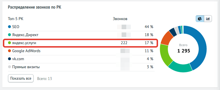 К сожалению, на данный момент сервис Яндекс.услуги не предоставляет статистики по звонкам (только просмотры карточки). Но, к счастью, у данного проекта уже был подключен Roistat. Чтобы отследить звонки с сервиса яндекс.услуги, мы подключили отдельный номер.