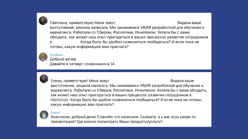 - В первом мы выходим на руководителей отделов обучения и HRD с кейсами экономии ресурсов на обучении с помощью VR-тренажеров.