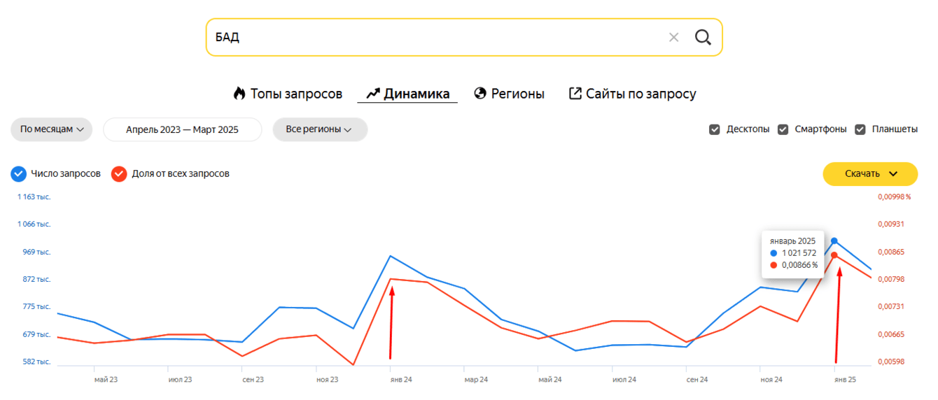 Мы четко зафиксировали сезонность интереса к БАД: в холодное время года (особенно в январе) люди активнее интересуются этой темой, что снижает стоимость привлечения. С приходом весны интерес снижается, что отражается на росте стоимости подписки.