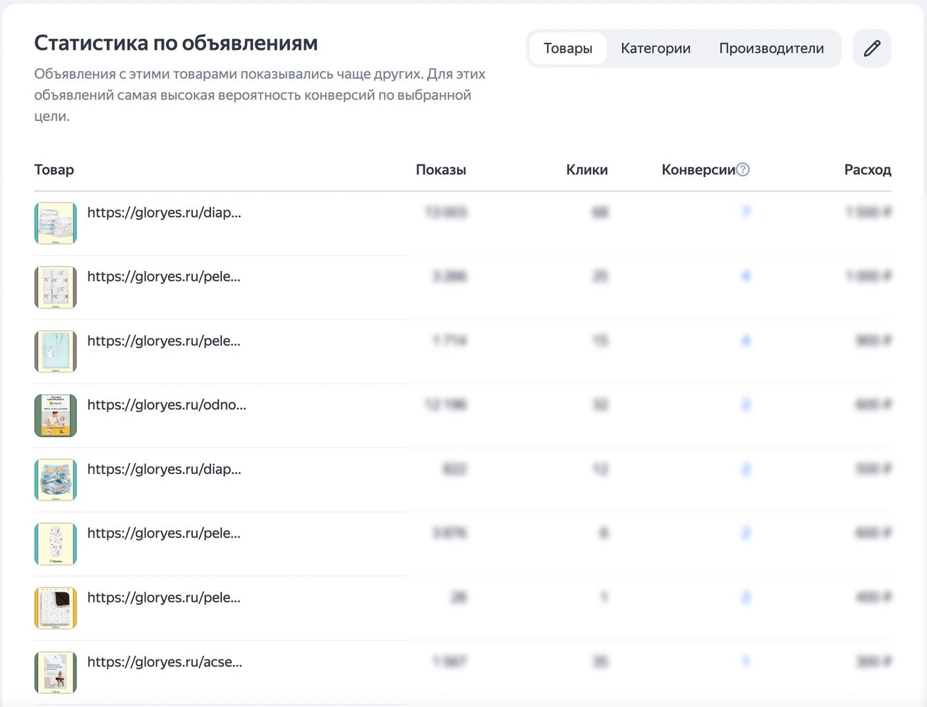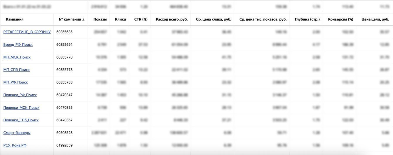 Помимо основных поисковых кампаний (брендовые запросы и небрендовые запросы по категориям), мы запустили кампании в РСЯ (Рекламная сеть Яндекс), смарт-баннеры, а также товарную кампанию из товарного фида на сайте Gloryes.
