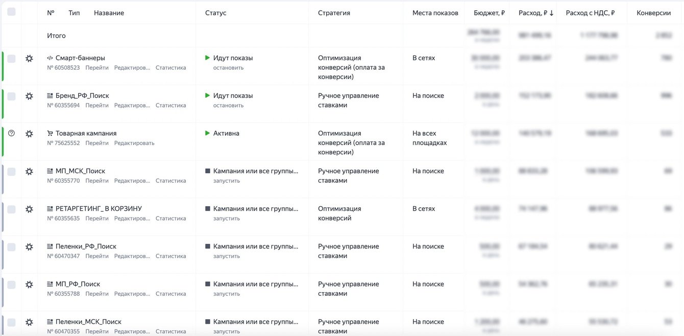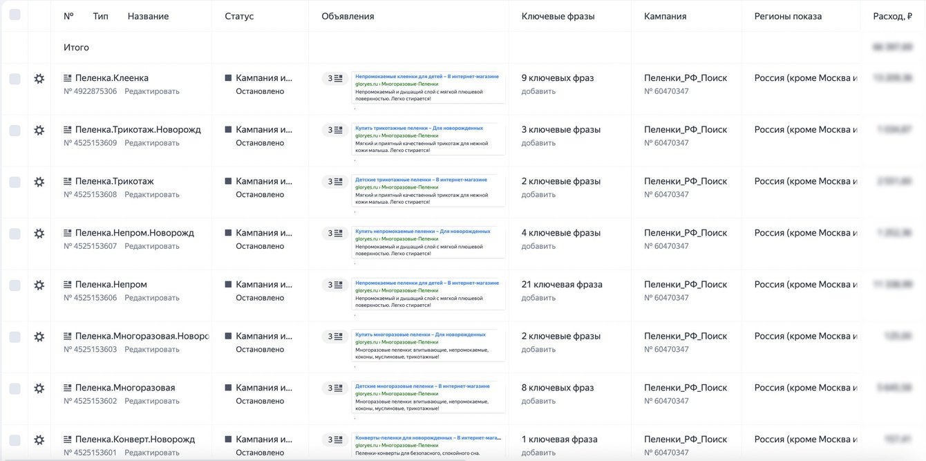 В итоге мы получили рекламные кампании: