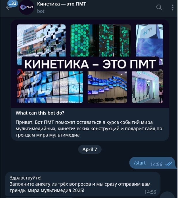 Подготовили и запустили чат-бот в Telegram для сбора контактов на выставке, в которой участвовал клиент. В виде лид-магнита отдавали «ТОП-тренды мира мультимедиа». Похожий кейс описали здесь.