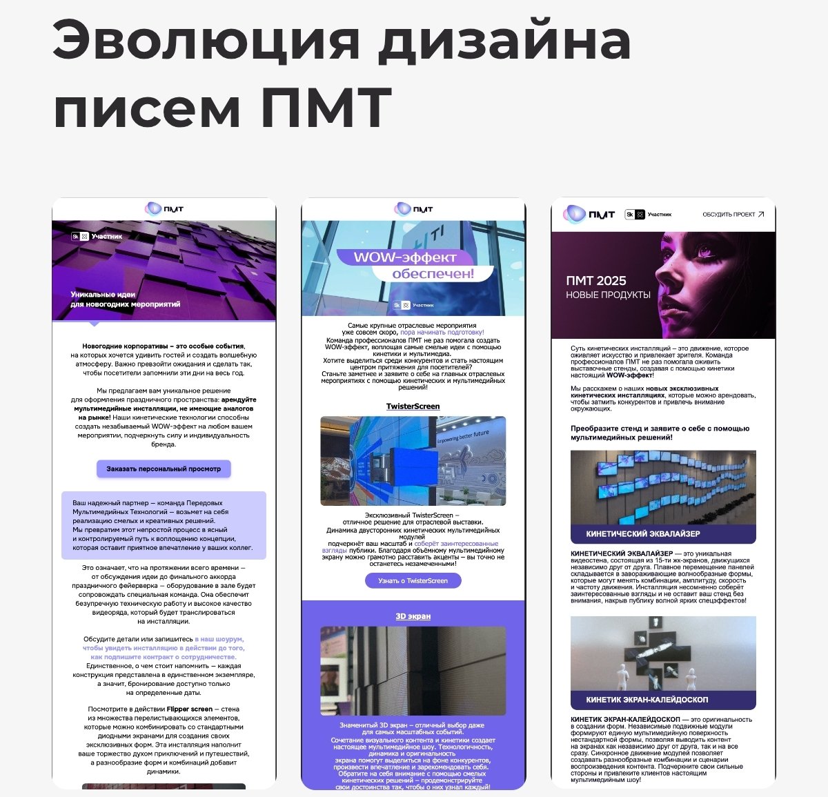 Этому этапу уделили особое внимание. Продукт визуальный и сложный. Его легче показать, чем пытаться рассказать, как всё работает. Кинетические инсталляции — это движение. Контент должен быть соответствующий. В оформлении писем мы подстраивались под новый фирменный стиль ПМТ. В марте 2025 года клиент сделал ребрендинг и перешёл на более тёмное оформление, которое отражает диджитальность и технологичность компании.