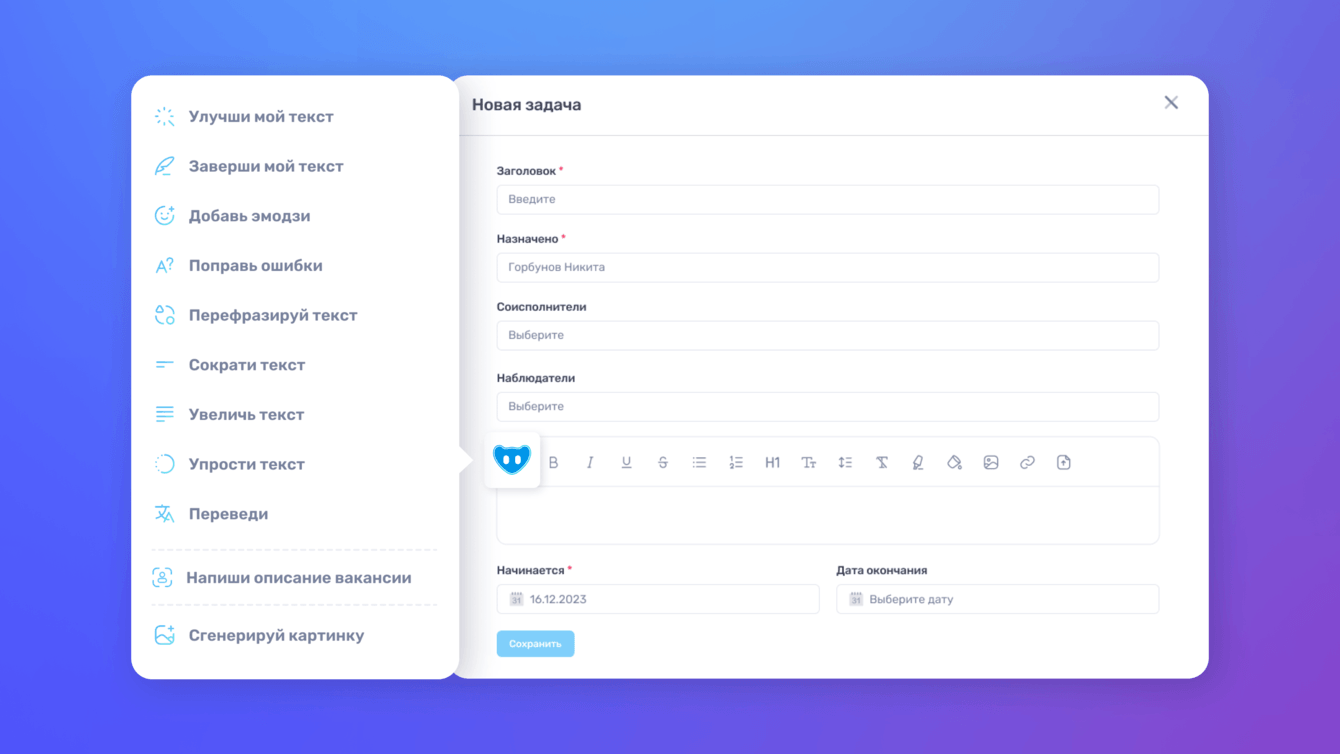 6. Подключили искусственный интеллект на базе GigaChat с голосовым помощником. Ассистент умеет создавать описание вакансии, устанавливать задачи, создавать объявления.