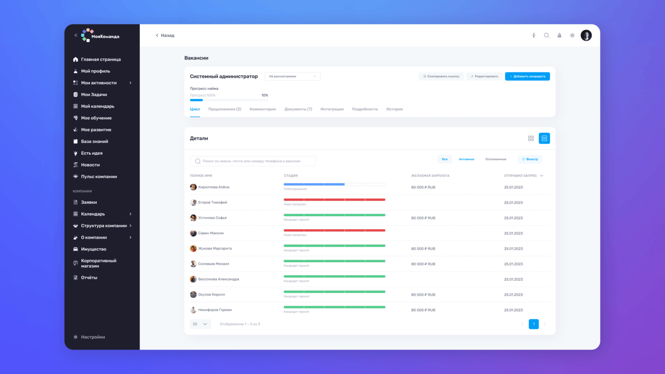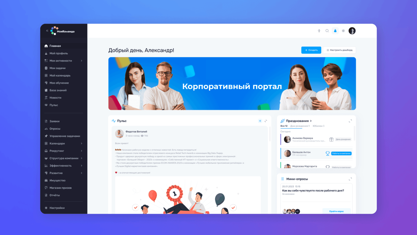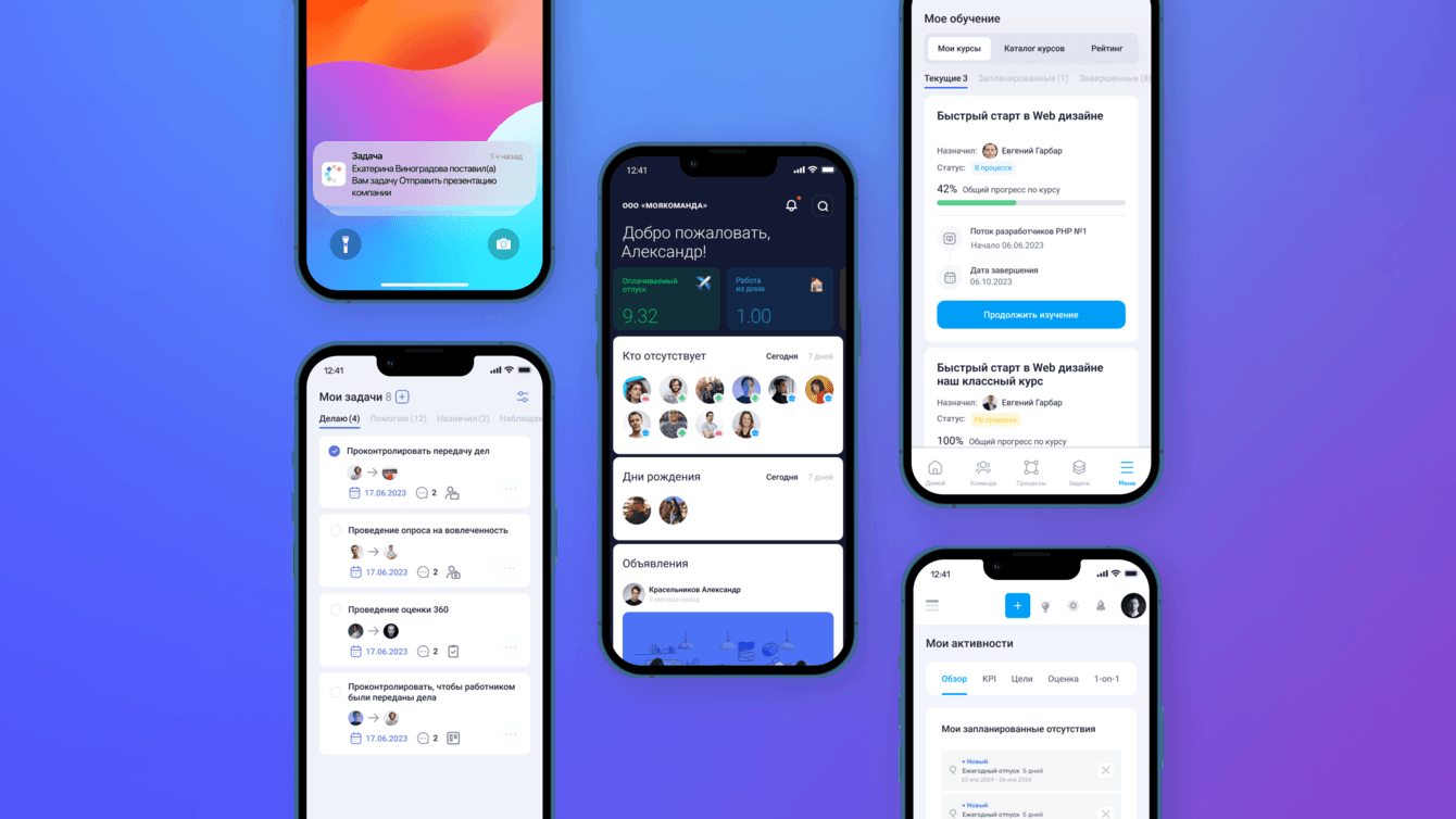 «МояКоманда» – это HR-экосистема, объединяющая в себе инструменты для найма, обучения, мотивации, развития талантов, оценки производительности и взаимодействия между сотрудниками. Весь этот функционал объединен в едином цифровом пространстве, что позволяет более эффективно координировать усилия и достигать синергии в работе коллектива.
