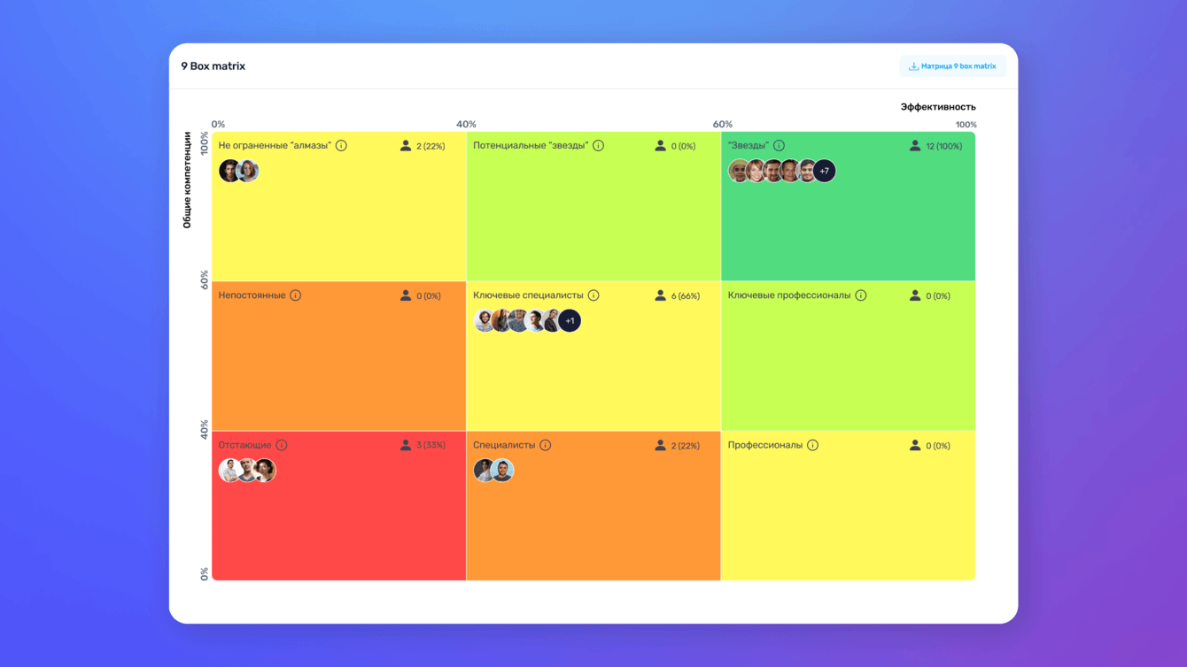 3. Расширили оценку 360: добавили шаблоны вопросов (автоматическое создание должностного шаблона при выборе должности), ninebox matrix (сотрудники разбиты на категории по своим компетенциям и личным характеристикам).
