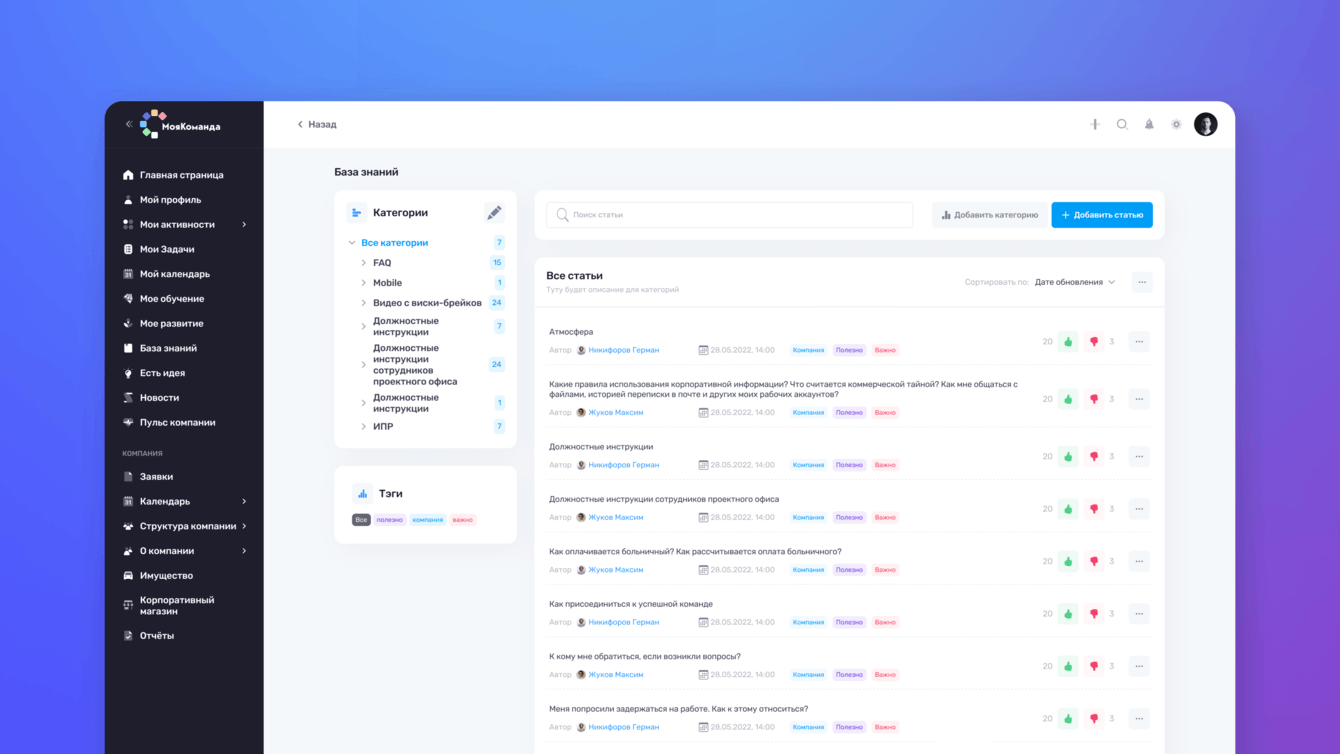 — База знаний, которая позволит накапливать информацию о компании или профильных направлениях в структурированной форме, обеспечивая обучение сотрудников и быстрый доступ к важной информации.