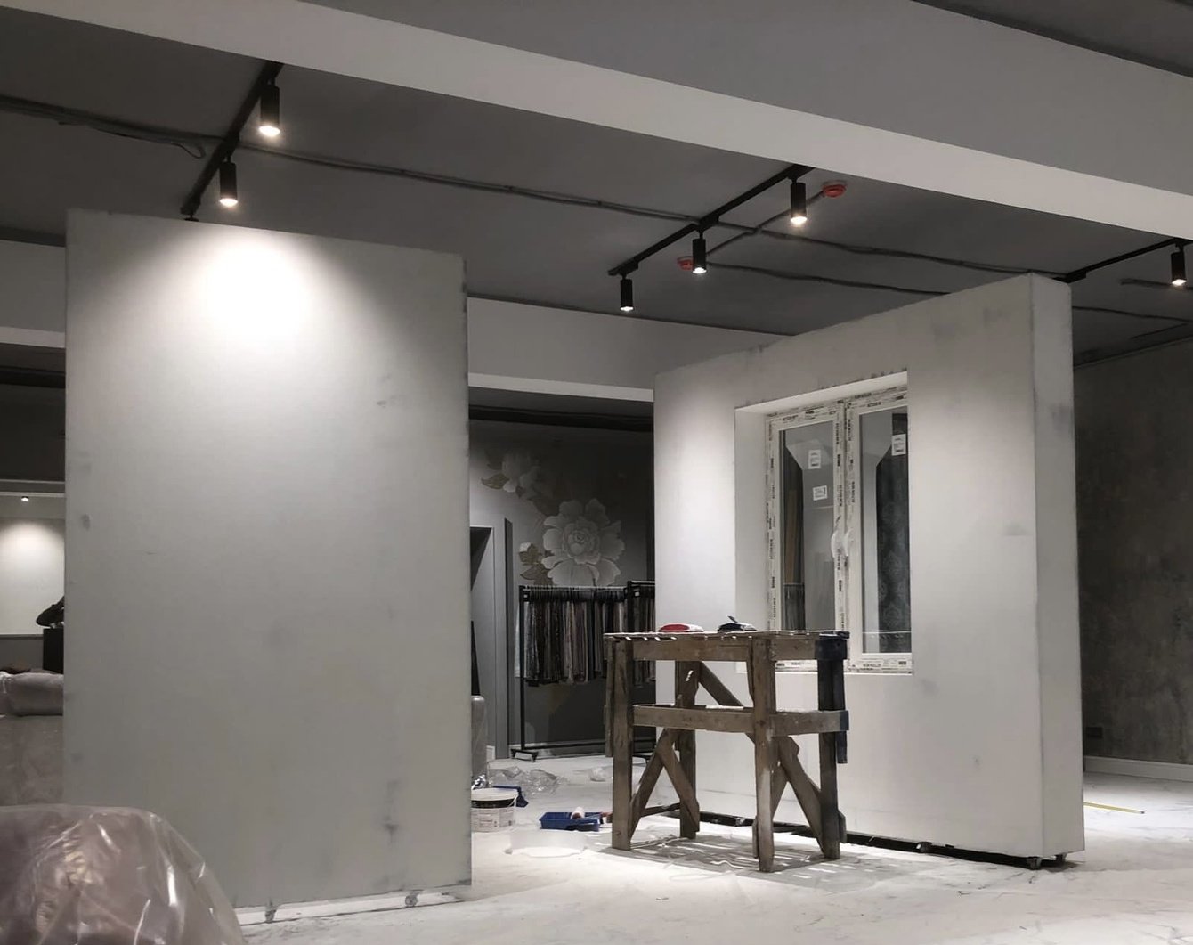 Чтобы понимать, с чем именно, где будем работать и что потребуется, предварительно выехали на место для осмотра локации. Посмотрели площадку, услышали пожелания заказчика и проконсультировали по поводу подготовки для создания идеальной обстановки. Сошлись на том, что нужно сооружать декоративную стену с окном, помыть помещение до блеска и приготовить главных героинь (то бишь шторы) к выходу в свет.