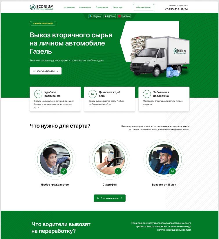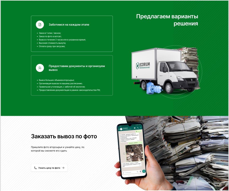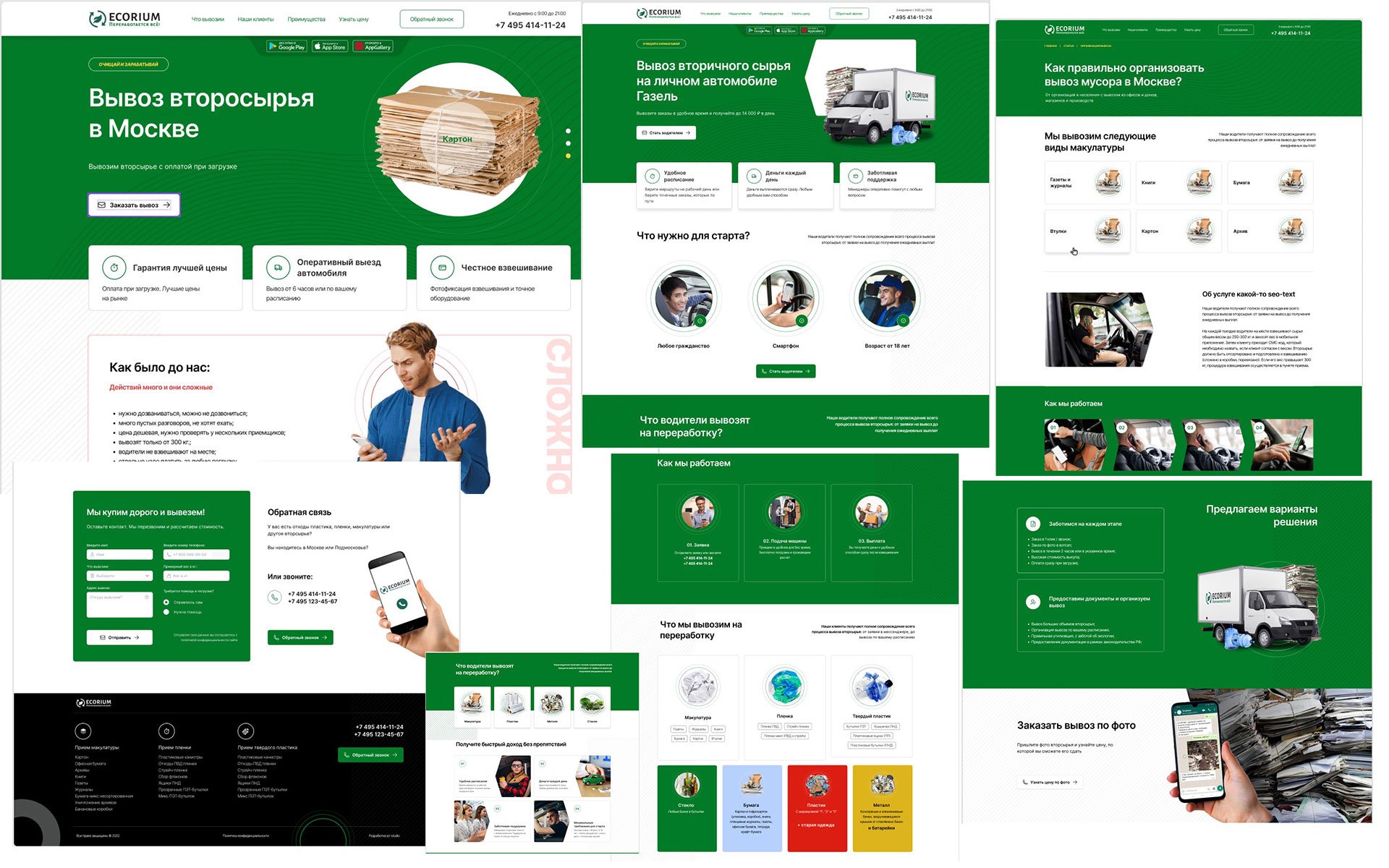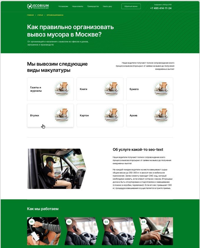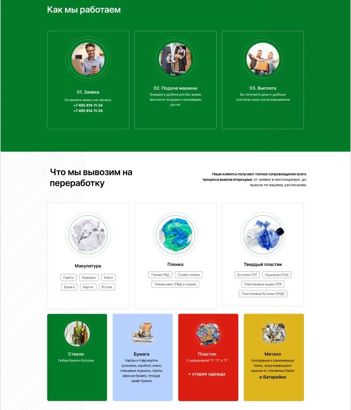 разработка дизайн-концепции по ТЗ клиента, создание макета главной страницы, создание каталога и подкаталога вторсырья с фильтрами, создание каточек вторсырья, создание раздела для водителей, создание каталога публикаций и страницы одной публикации.