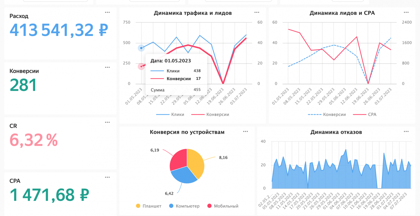 Стоимость лида с РСЯ была самой низкой как в старые добрые времена. Некоторые объявления давали лидов по 262 рубля. Максимальная стоимость была 530 рублей.