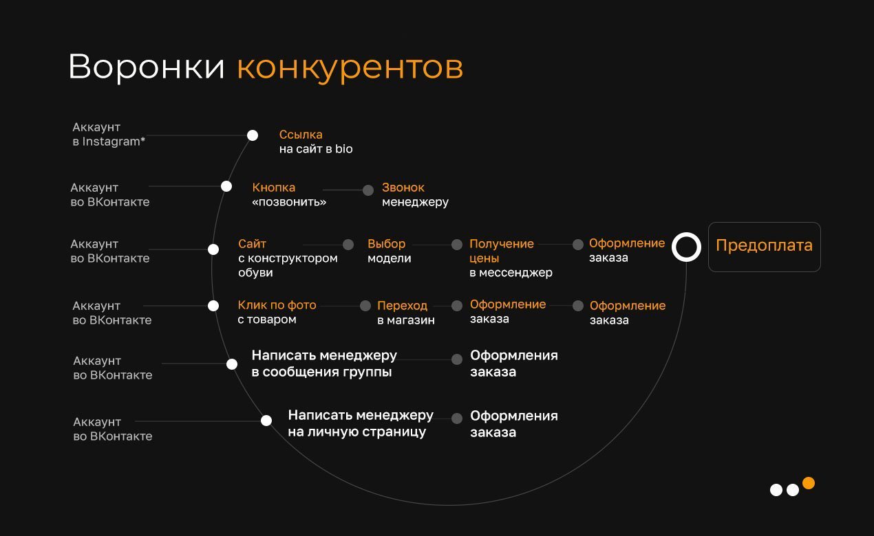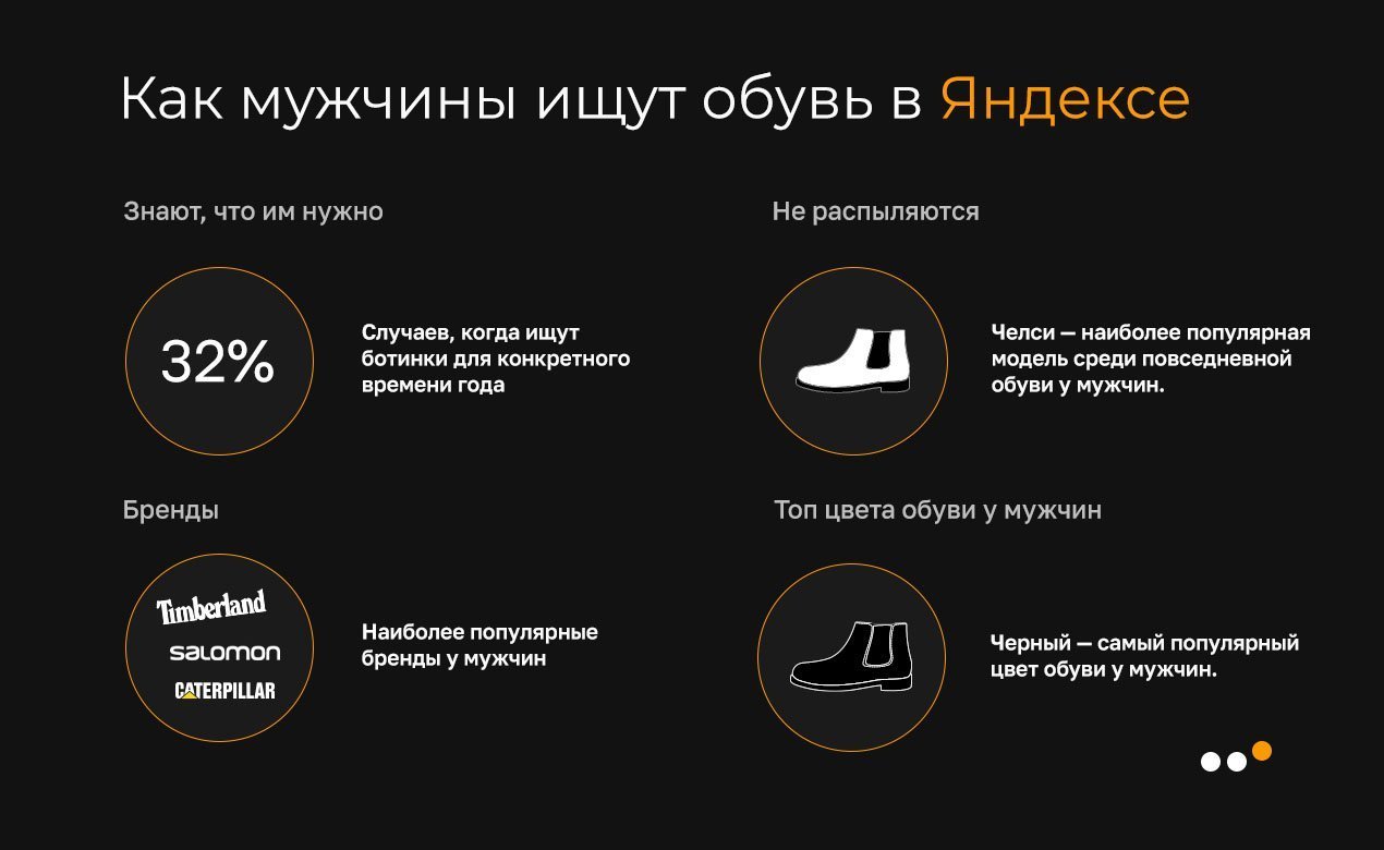 Начали с анализа исследований интернет-коммерции в нише. Изучив исследование «Яндекса» «Как пользователи Яндекса ищут одежду и обувь в интернете», мы узнали, что 32% мужчин ищут пару обуви для конкретного времени года. Самый популярный товар — ботинки Челси. Люди, находящиеся в Москве и Питере, обычно делают заказ на индивидуальный пошив обуви в шоуруме. В других городах — онлайн, самостоятельно снимают мерки и отправляют менеджеру.