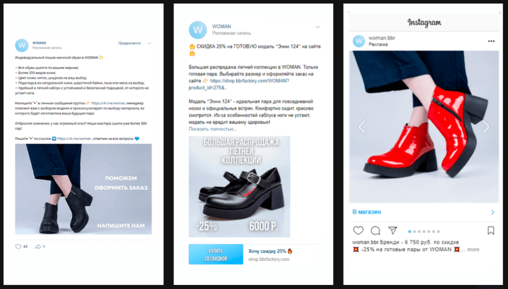 В объявлениях для таргетированной рекламы Woman мы демонстрировали УТП бренда, рассказывали о преимуществах и вели напрямую в сообщения сообщества, а также устраивали распродажи и вели аудиторию на сайт
