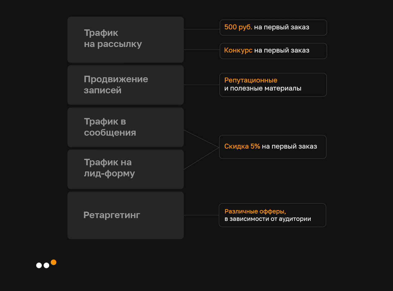 Последний этап в стратегии — использование продающих механик. В нашем случае это скидки и распродажи обуви, а также специальные предложения по горячей аудитории.
