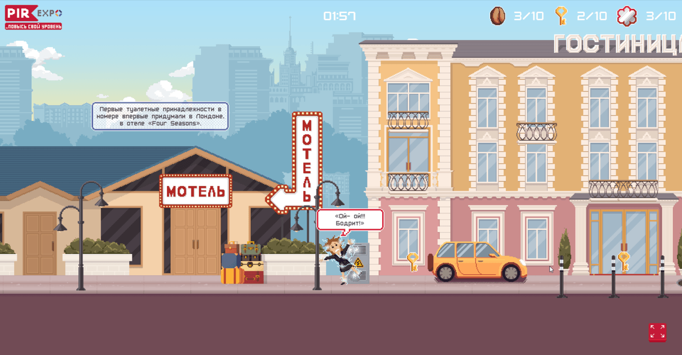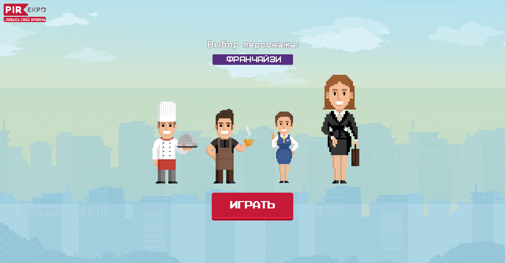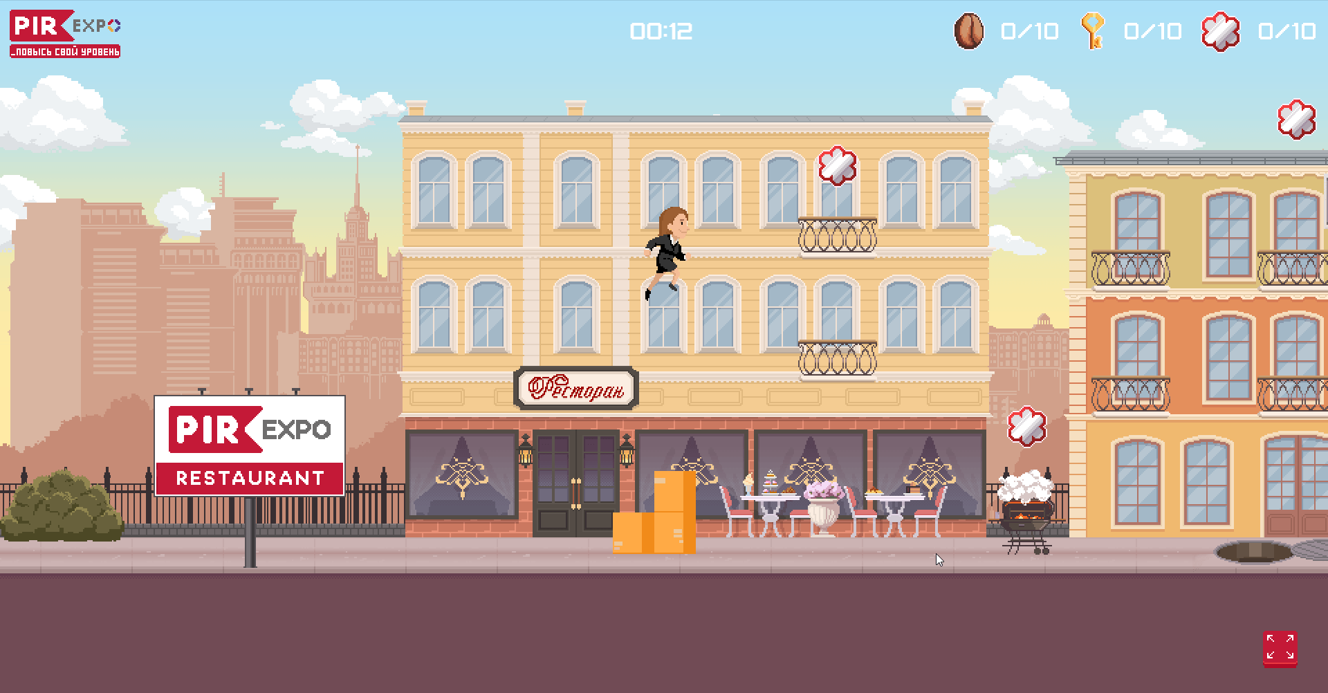 Создать интерактивную 2D-игру в жанре платформера для тематической выставки гостиничного и ресторанного бизнеса. Проект должен был в увлекательной форме познакомить посетителей с ключевыми профессиями отрасли (шеф, бариста, консьерж, франчайзи) и обеспечить вовлечение через игровой процесс.