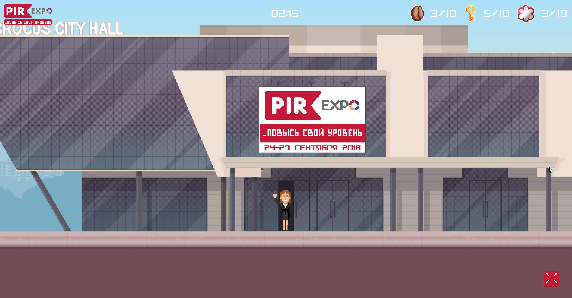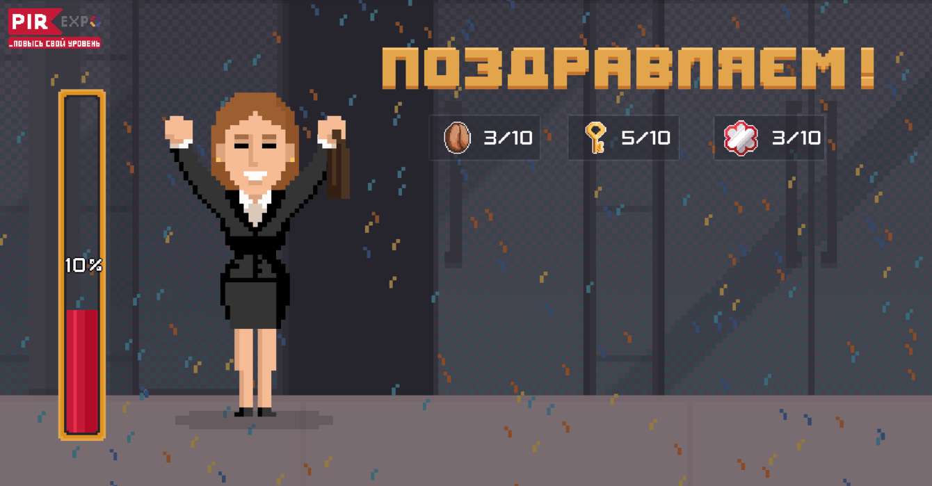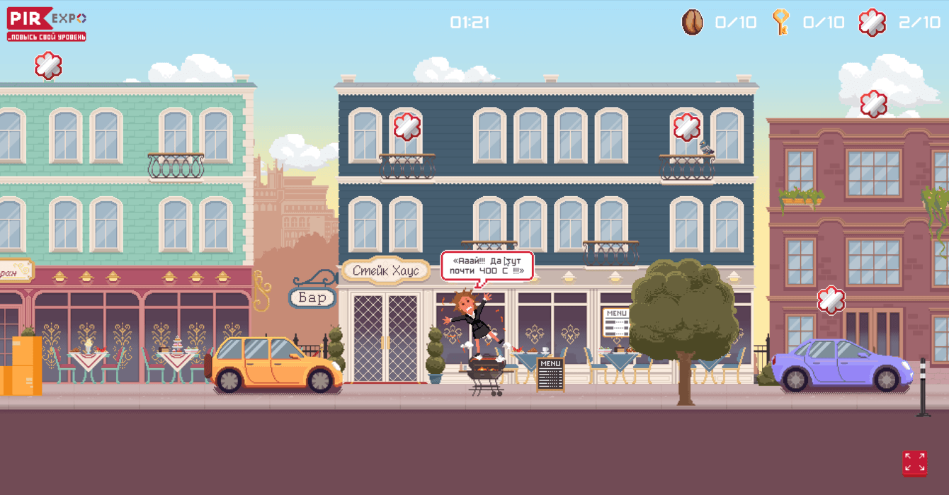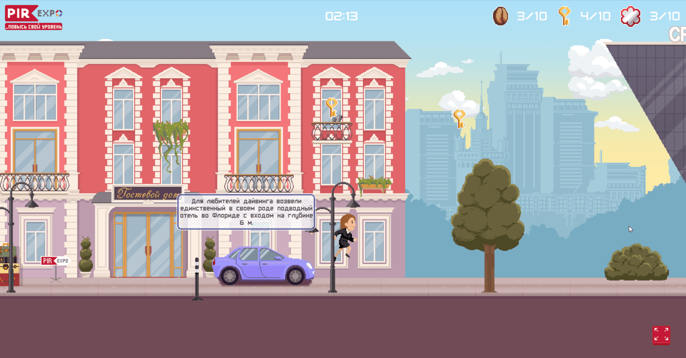 Создать интерактивную 2D-игру в жанре платформера для тематической выставки гостиничного и ресторанного бизнеса. Проект должен был в увлекательной форме познакомить посетителей с ключевыми профессиями отрасли (шеф, бариста, консьерж, франчайзи) и обеспечить вовлечение через игровой процесс.