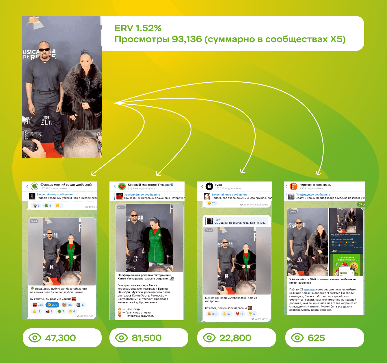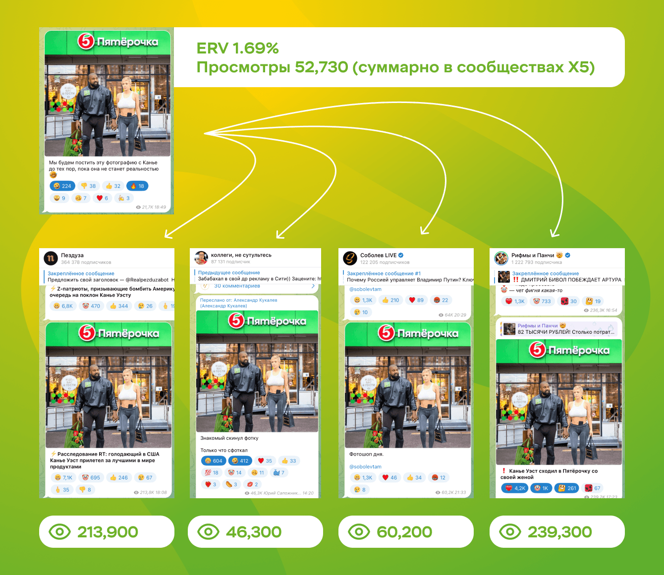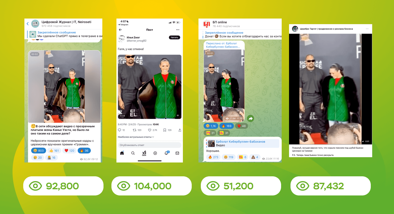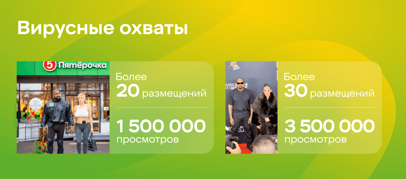 30 июня Канье Уэст действительно посетил Москву, и мы повторно опубликовали материал. Эта публикация завирусилась, собрав более 20 зафиксированных размещений и значительный охват — более 1 000 000 показов.
