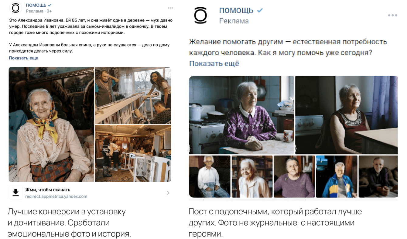Клиент сначала читал трогательные истории подопечных и только в конце ему предлагали установить приложение и помочь. Такие креативы выглядели менее рекламными и привлекали больше аудитории.