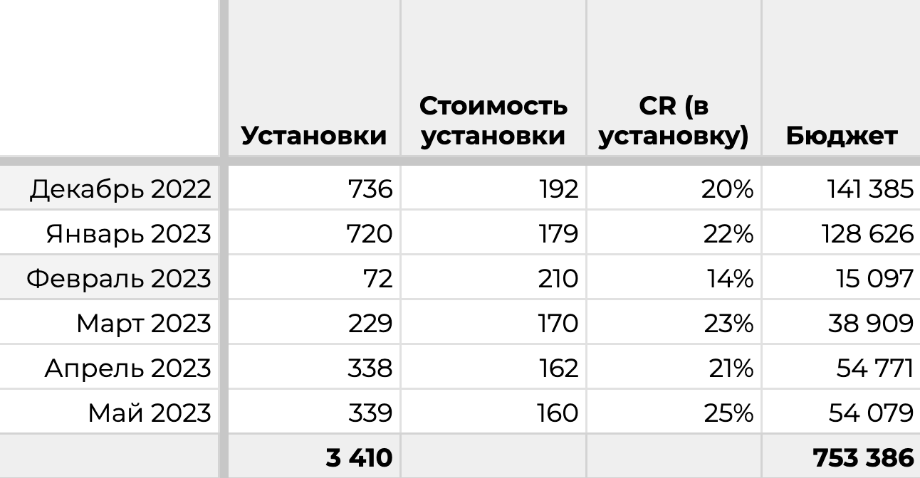 Промежуточный результат. Тестировали креативы 5 месяцев, но поняли, что нужно изменить подход. Установок получили мало и за дорого.