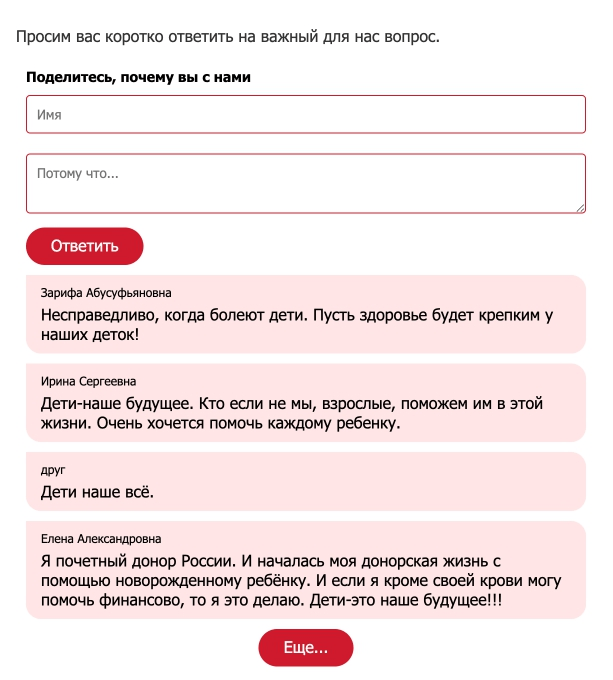 В итоге мы согласовали два письма в этих форматах. В первом благотворители могли рассказать, почему для них важно помогать, и сразу посмотреть ответы других. Задачей письма было не только проверить, насколько аудитории понравится новый формат, но и повысить ее лояльность.
