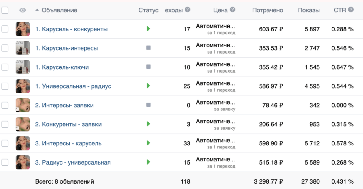 По настройкам лучше всего зашла аудитория на радиус и на автозаинтересованную аудиторию, с форматом «карусель» и универсальная запись.