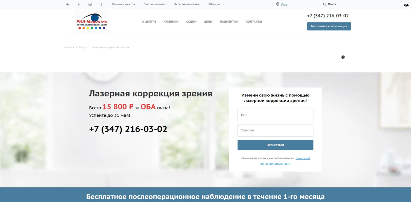 - Провели глубокий аудит и удалили неуникальные тексты, заменив их материалами, адаптированными под запросы пациентов (например, "лазерная коррекция зрения в Уфе").