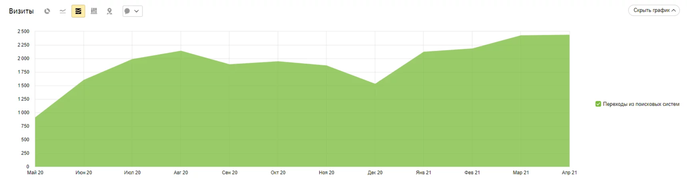Трафик из поиска вырос в 2,5 раза — пациенты стали чаще находить клинику через Яндекс и Google.