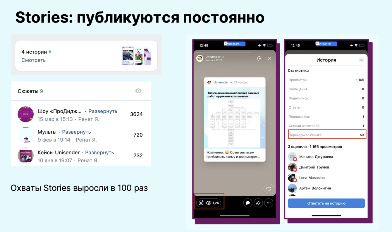 3. Средние охваты Stories в сообществе выросли в 1000 раз. Было: 10-12 просмотров, стало 1000-1200. 4. Регистраций