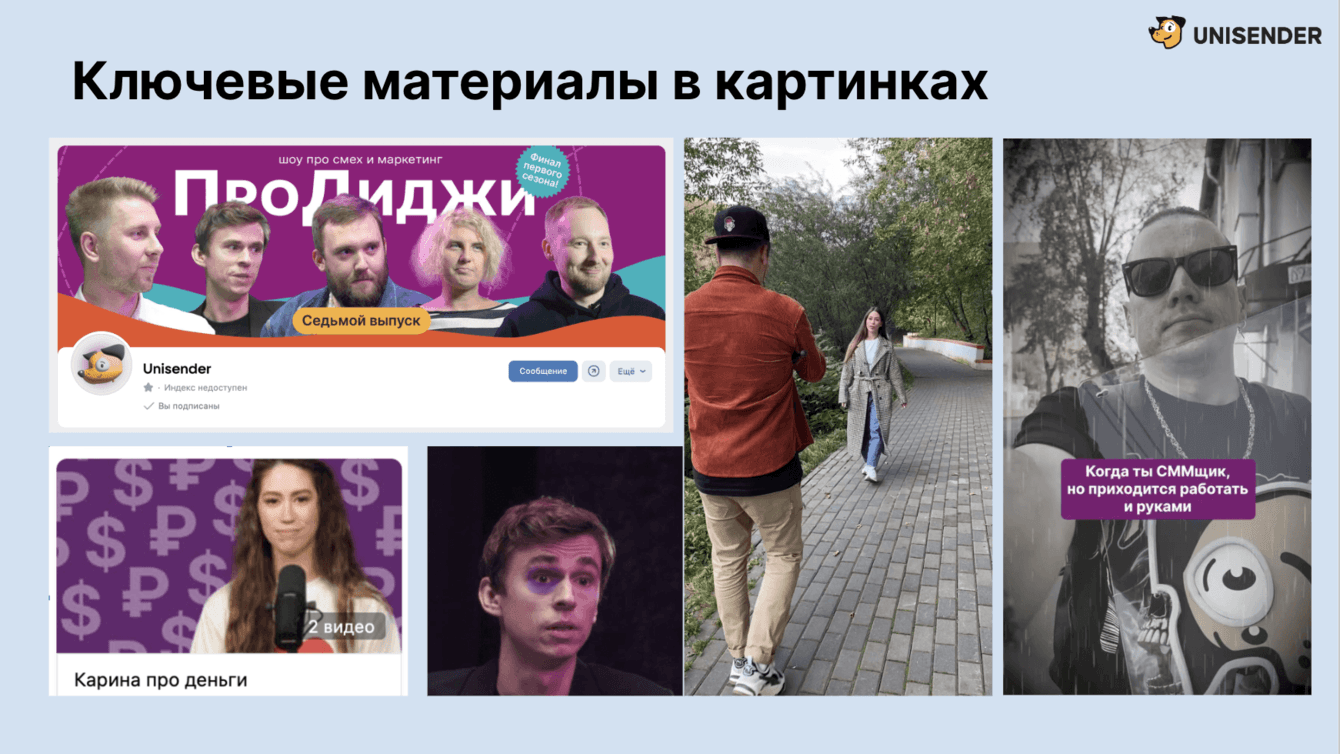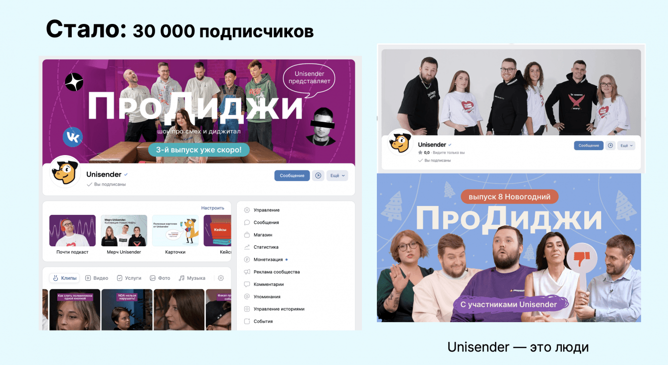 6. Реализовали концепцию «Unisender это люди». Теперь публикуется персонализированный контент с указанием конкретных авторов, в оформлении контента и обложек сообщества используются фотографии реальных сотрудников и партнеров, производится много видеоконтента.