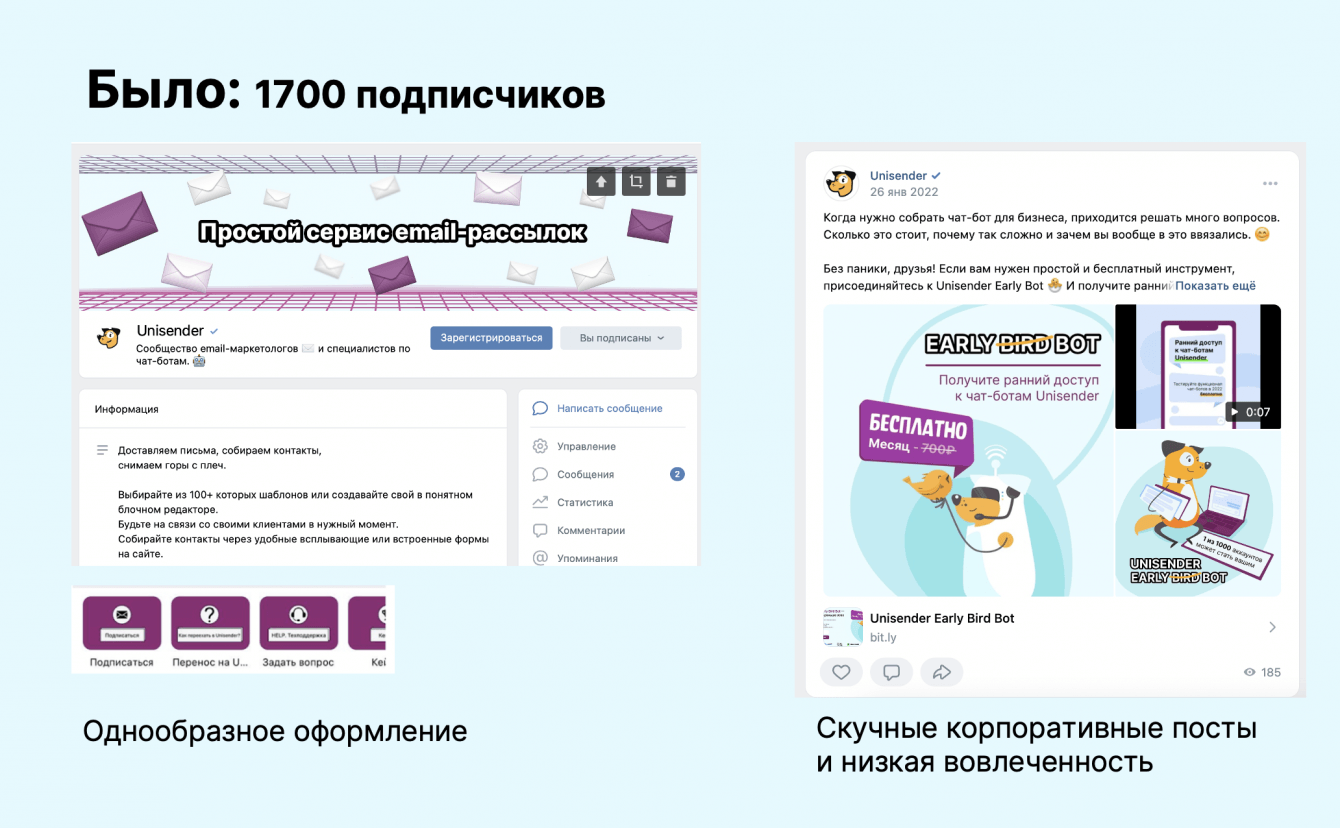 Unisender — российский сервис email-рассылок. 13 лет на рынке, 870000+ клиентов. До событий 2022 года бренд строил свою коммуникацию преимущественно в зарубежных соцсетях. После их запрета в РФ бренд поставил задачу развить сообщество во ВКонтакте.