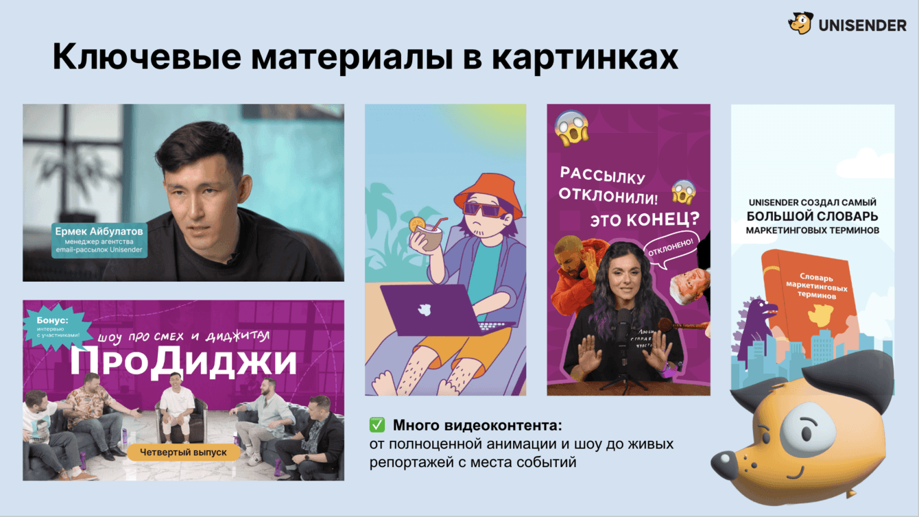 Ранее в визуалах бренда использовался только нарисованный маскот: собака Юни Гудбой (можно увидеть её на сайте компании www.unisender.com). Мы решили отойти от использования в соцсетях только виртуального персонажа и организовали фотосессии и видеосъемку сотрудников.