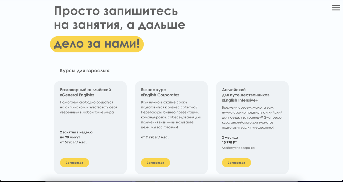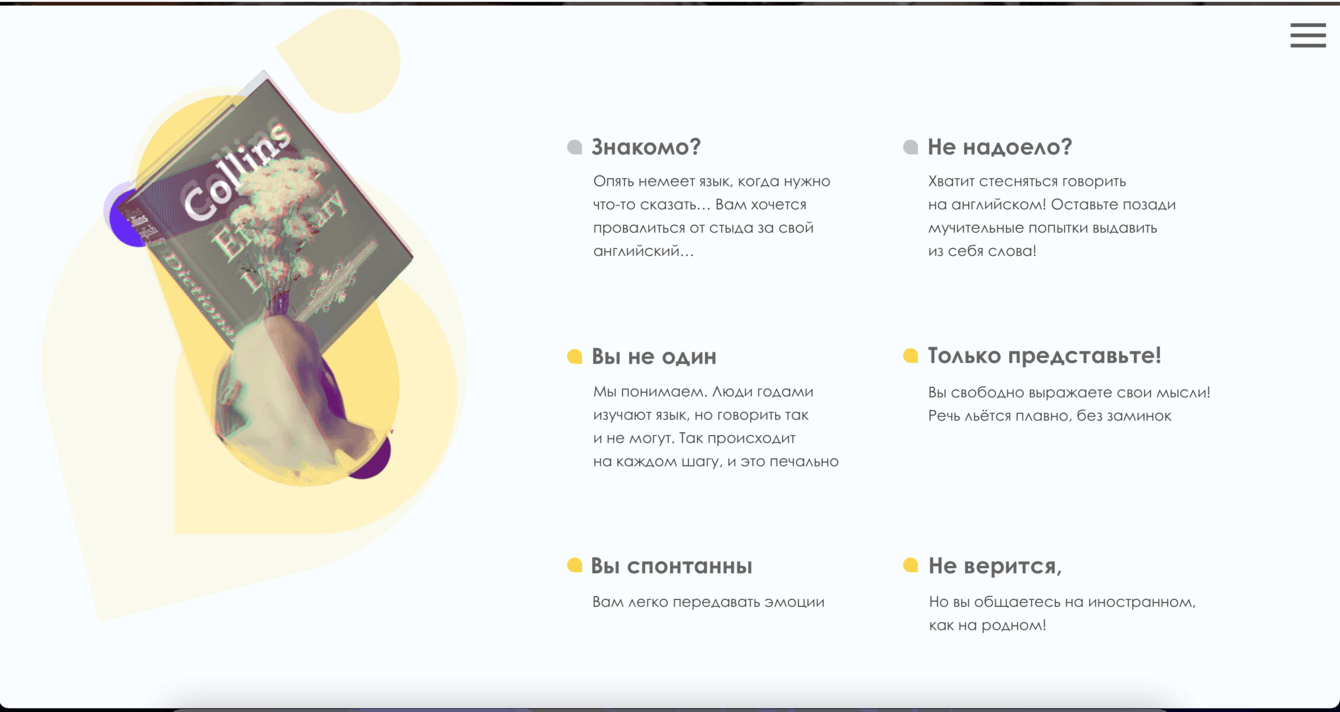 Сделать яркий сайт для желающих учить иностранный язык. Сделать версию для слабовидящих, а так же удобную и стильную навигацию.