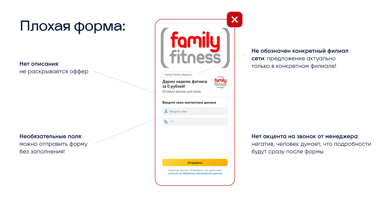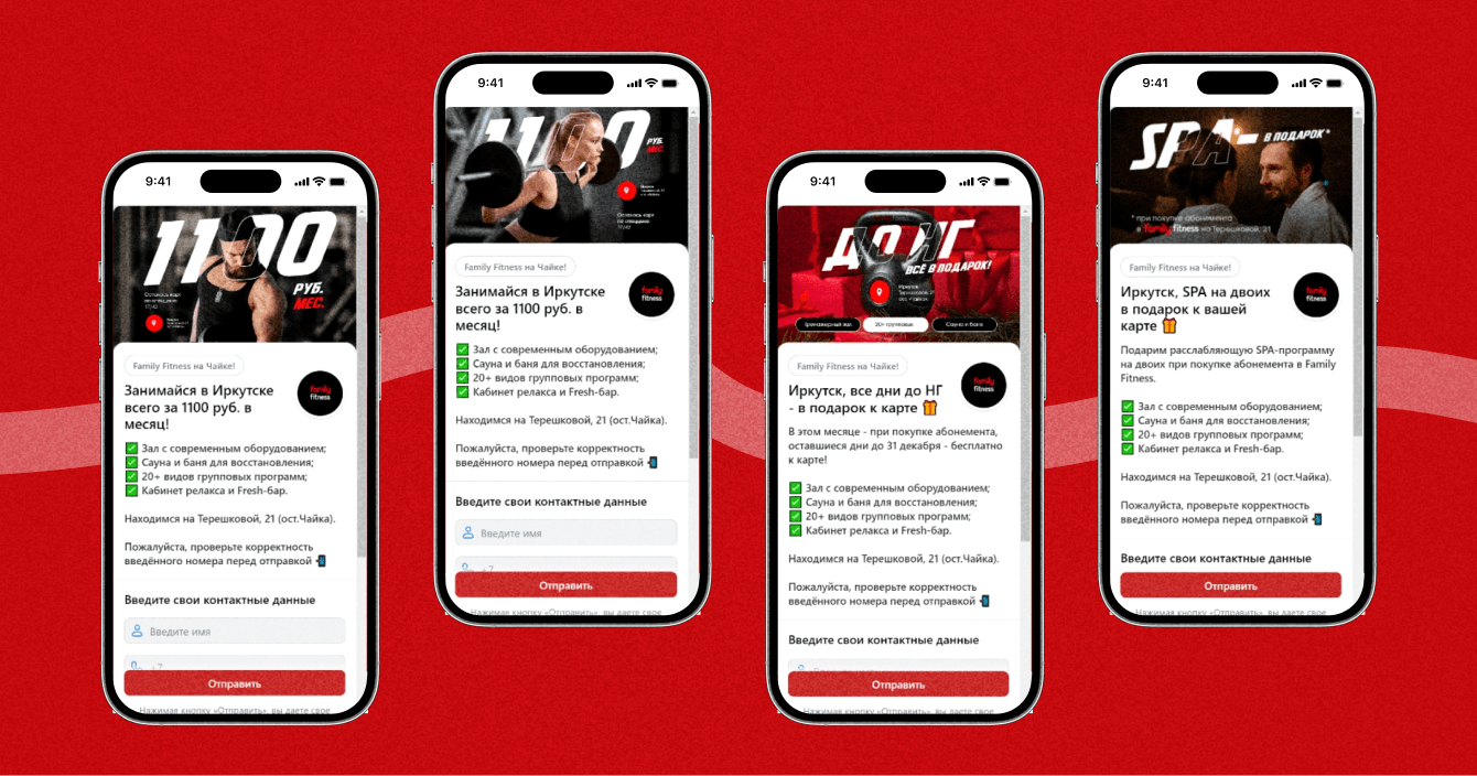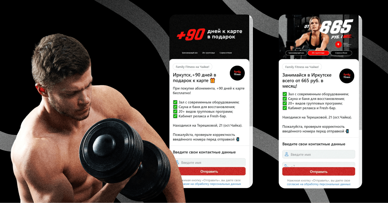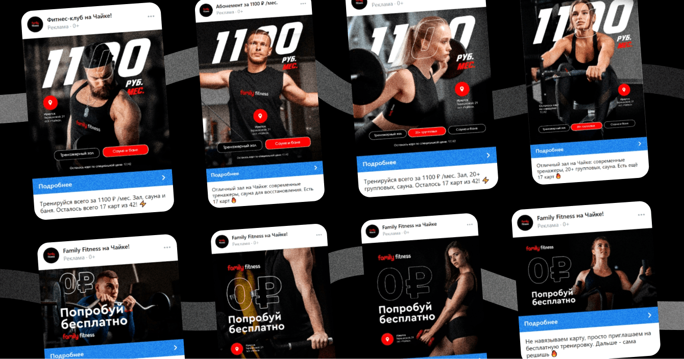 Филиал сети фитнес-клубов Family Fitness. Нет доступа к группе ВК и посадочной странице. Жесткое ограничение показа рекламы: радиус 2 км, чтобы не конкурировать с другими клубами сети.