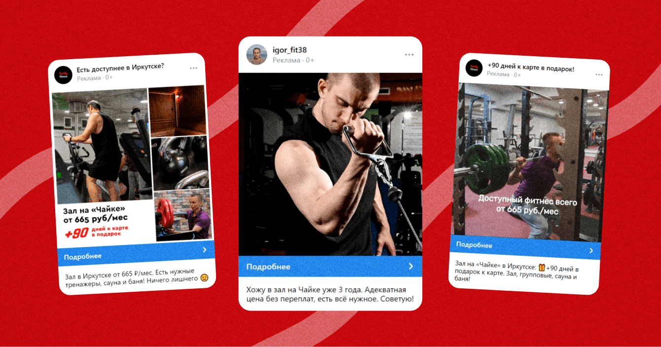 Главный инсайт этой кампании: на гиперлокальном гео узкие аудитории выгорают мгновенно. Спасает только широкая настройка в связке с очень точным визуальным оффером (акцент на тренажеры для мужчин и на групповые программы для женщин). Мы не стали ждать идеальных студийных промороликов, а быстро собрали креативы из простых подсъемок на телефон, докрутив их через ИИ. В итоге — потолок прошлых агентств пробит, а цена лида оказалась в рамках KPI.