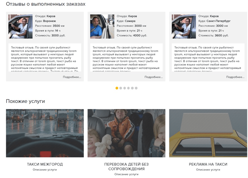 Наличие отзывов клиентов и рекомендованных услуг - важный фактор доверия для любого сайта услуг. Поэтому был добавлен отдельный блок "Отзывы" и секция "Похожие услуги" на страницах с описанием каждого вида перевозок.