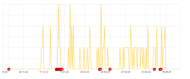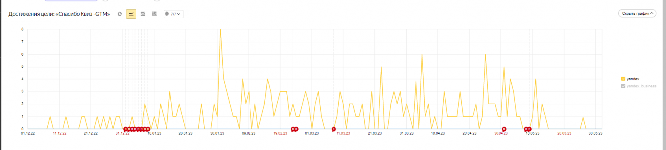 Макроконверсии с периода декабрь 2022 - май 2023 года (данные взяты из Я.Директа и Я.Метрики). Скрин показывает цель "Отправка данных с квиза":