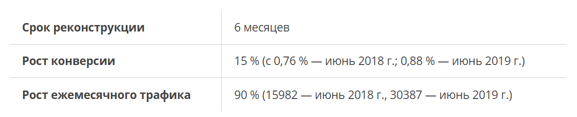 До начала работ (июнь 2018 года) в месяц на сайт заходили 15 982 посетителя. Спустя 6 месяцев после завершения реконструкции месячный объем трафика вырос на 90 % и составил 30 387 посетителей. Самое важно в этой статистике то, что за счет грамотно проведенного переезда мы не потеряли трафик.
