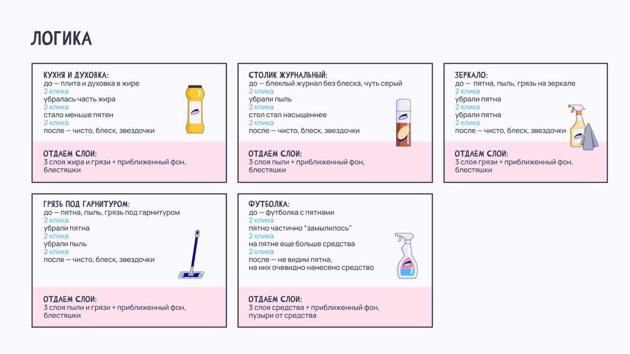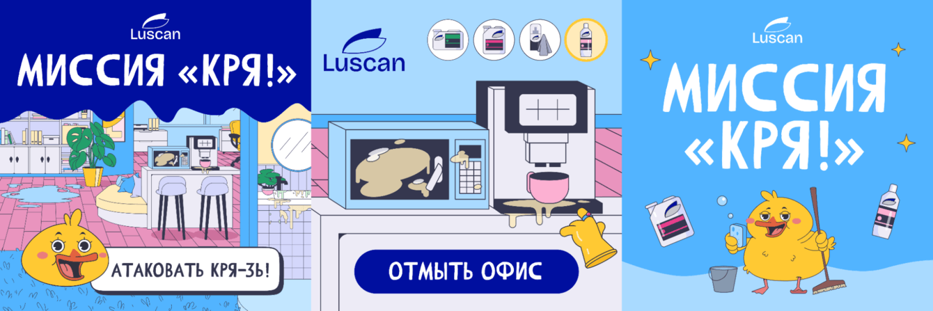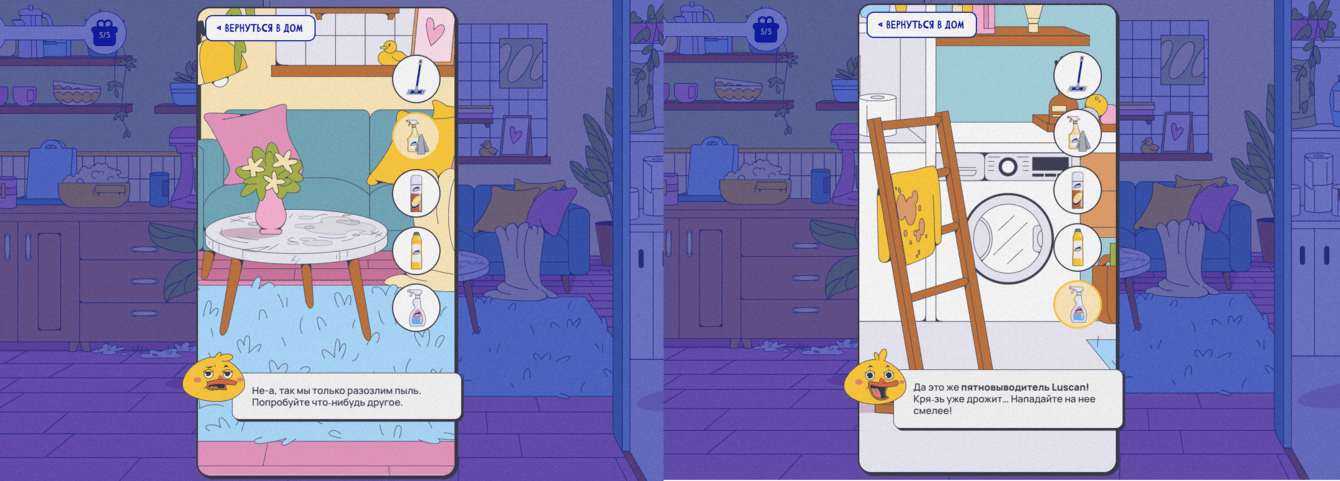 Клиенту нужно было продвинуть средств для уборки Luscan, чтобы повысить знание о бренде и стимулировать продажи через промокоды. Для этого клиент предложил три игровые концепции на выбор, и после обсуждения мы остановились на геймплее «отмой офис и кухню» — механика из мобильных игр, где нужно выбирать правильное средство для каждой задачи.