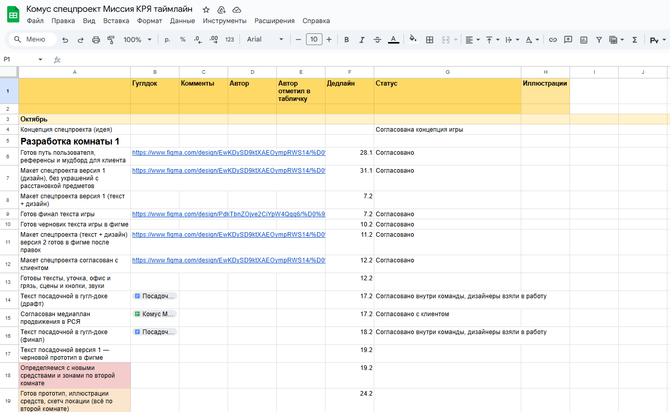 Чтобы ничего не упустить, шеф-редактор и проджект Катя Придворова составила таймлайн. Это сводная таблица, в которой прописывают каждый этап работы, сроки задач и кто за них отвечает.