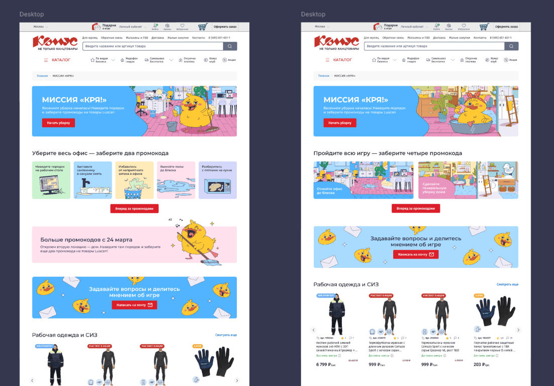 Вторую посадочную страницу адаптировали под оба уровня и добавили баннеры с изображением фонов офиса и дома и просто приглашали поиграть.