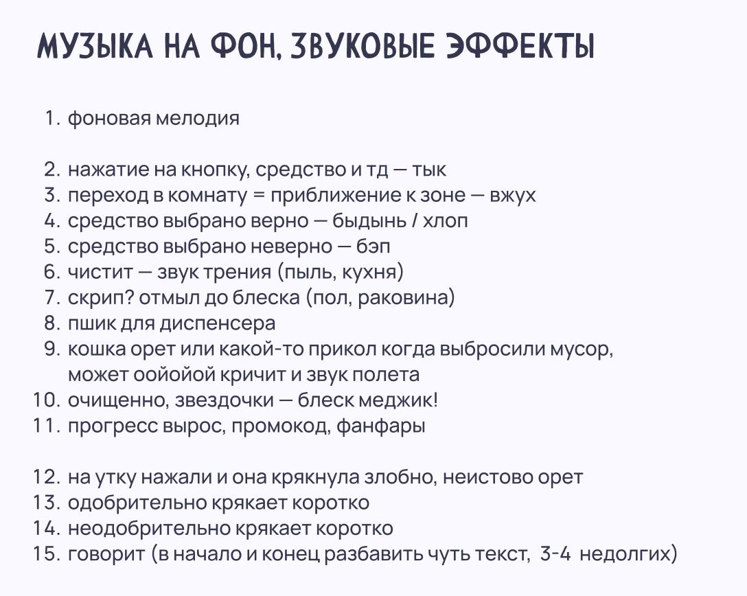 Для каждой локации подобрали отдельную музыку: для офиса — сдержанную фоновую мелодию в деловом стиле, для дома — энергичный хип-хоп, который мотивирует на активную уборку. Также добавили звуковые эффекты для взаимодействий: шипение спрея, скрип чистого стекла, звук разбрызгивания жидкости.