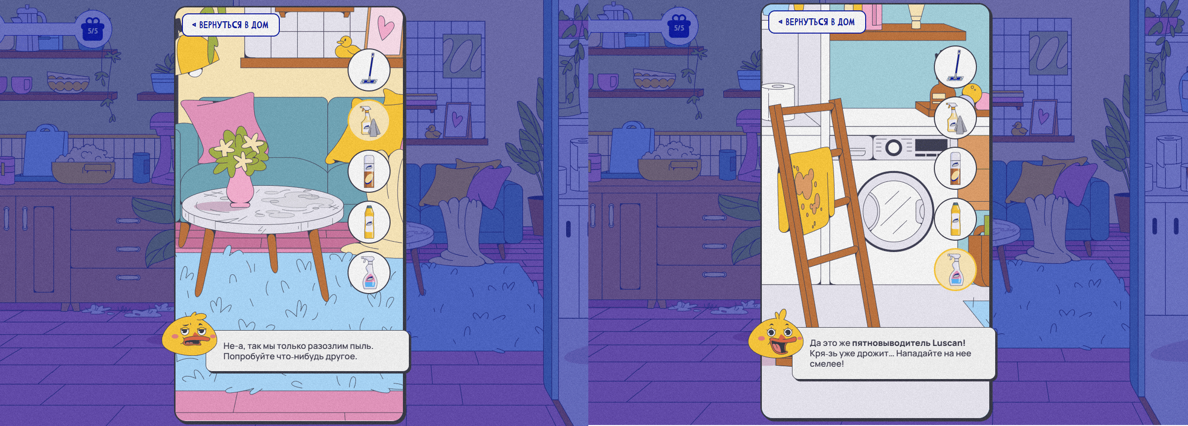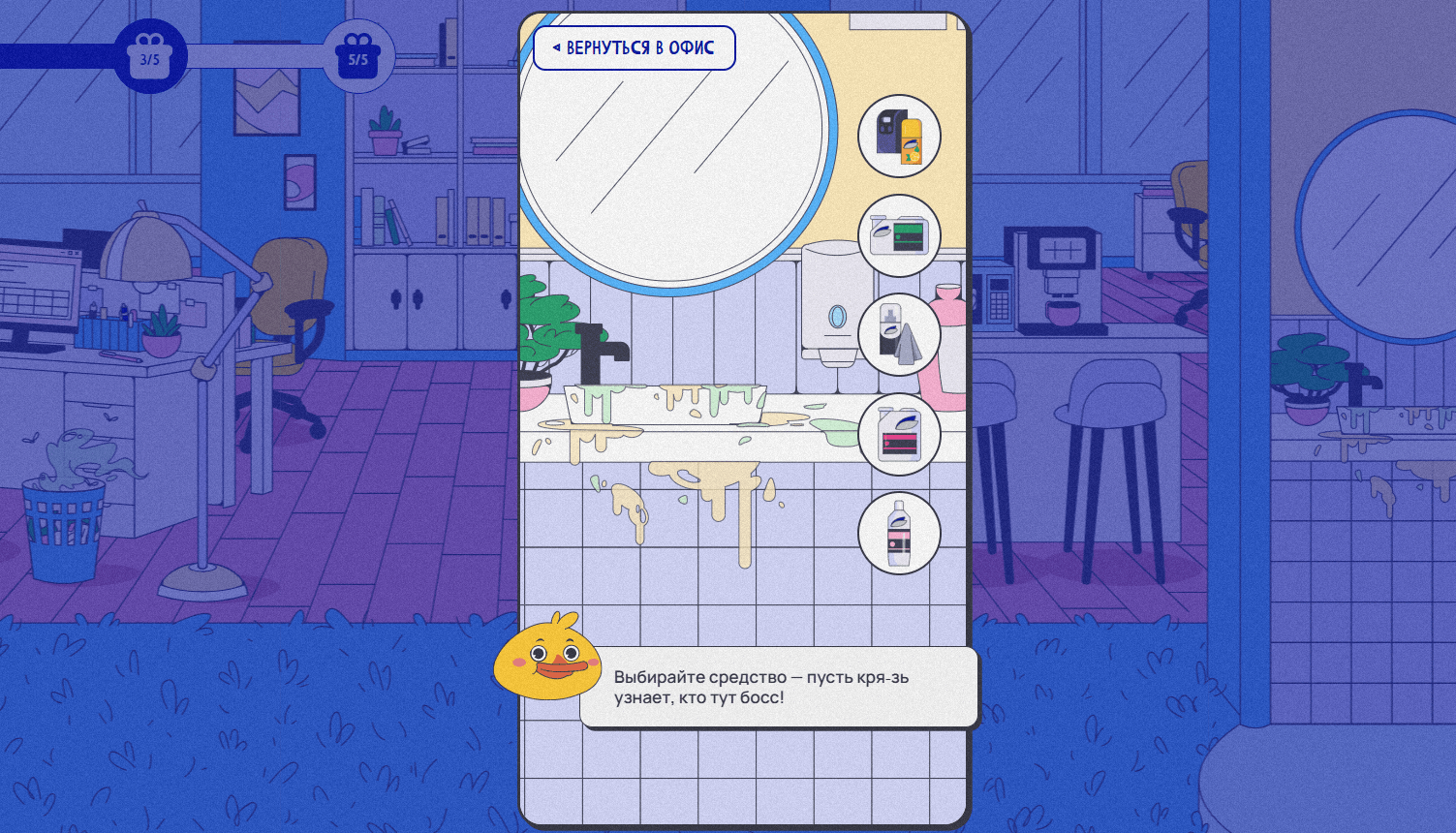 Если пользователь выбирал неправильное средство, утка сигнализировала об этом недовольной мордашкой, кряканьем и фразой. Сама проблема не решалась: монитор по-прежнему оставался грязным, а корзина для мусора — полной. И наоборот: когда игрок угадывал, маскот хвалил его и подбадривал. Такой подход превратил игру из развлечения в полезный опыт: пользователи не просто кликали по экрану, а действительно запоминали, какое средство для чего предназначено.