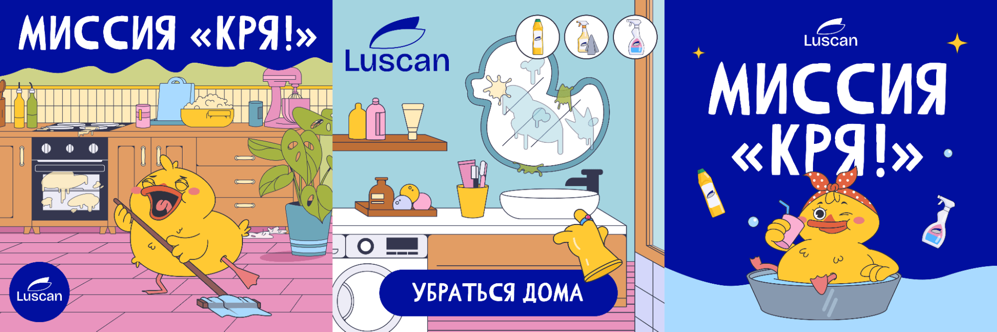Клиенту нужно было продвинуть средств для уборки Luscan, чтобы повысить знание о бренде и стимулировать продажи через промокоды. Для этого клиент предложил три игровые концепции на выбор, и после обсуждения мы остановились на геймплее «отмой офис и кухню» — механика из мобильных игр, где нужно выбирать правильное средство для каждой задачи.