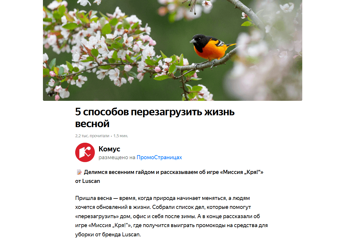 Запустили кампанию в ПромоСтраницах Яндекса. Мы создали специальную статью «5 способов перезагрузить жизнь весной», которая естественным образом интегрировала игру в полезный контент. В материале дали практические советы, как настроиться на новый сезон, сделали плавный переход к игровому формату и призвали попробовать силы в «Миссии „Кря!“» и получить промокоды от бренда Luscan.