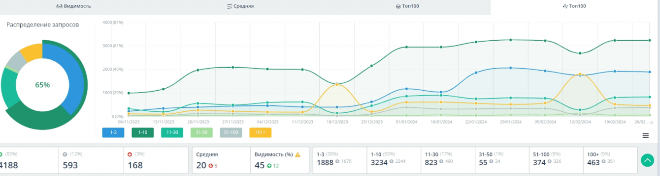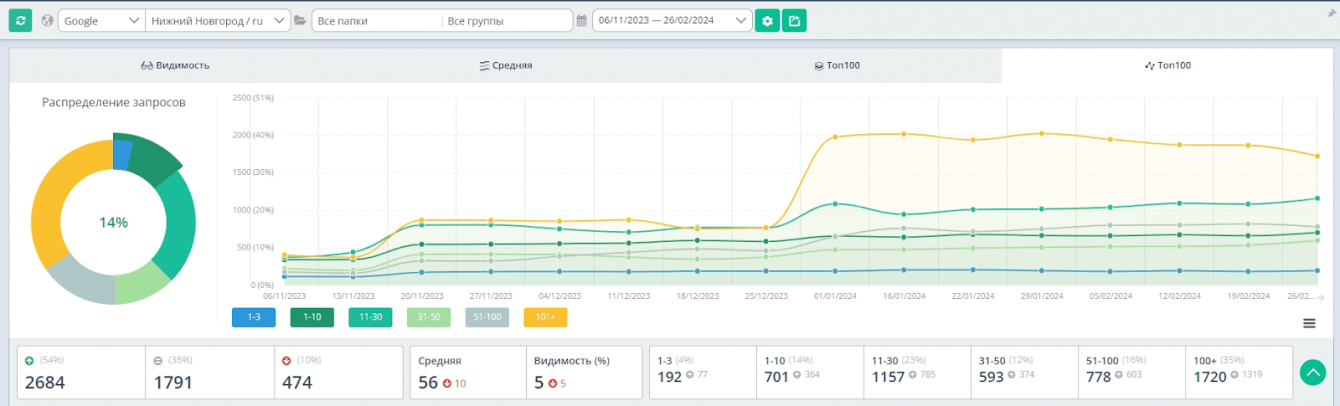 2)От 42% до 84% ключевых коммерческих запросов в топ-3 позициях по Нижнему Новгороду.