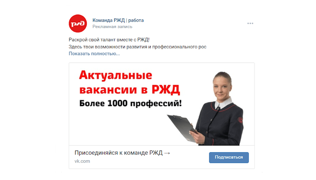 Связка – аудитория, заинтересованная в поиске рабочих профессий, и креатив, делающий упор на вакансии РЖД.